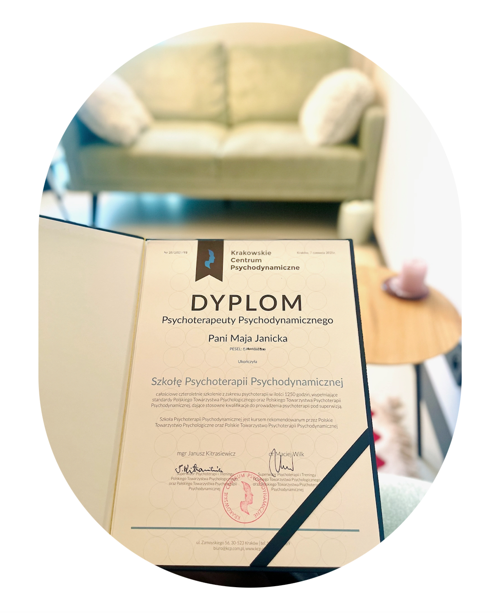 Moje wykształcenie akademickie w zakresie psychologii w zarządzaniu (lic., Akademia Leona Koźmińskiego) oraz socjologii stosowanej i antropologii społecznej (mgr, Uniwersytet Warszawski) spełnia wymogi określone w Rozporządzeniu Ministra Zdrowia dot. kwalifikacji do prowadzenia psychoterapii.